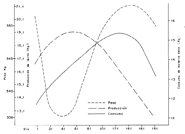 La ausencia de significancia en las diferencias entre razas permitió ignorar este factor en los posteriores estudios y considerar las 8 vacas como un sólo grupo. En el Cuadro 2 se presentan los cambios en los promedios del peso de las vacas, producción diaria de leche, consumo de materia seca y de los dos factores climáticos (temperatura media ambiental y humedad relativa) durante los 6 meses de estudio. Considerando que el peso promedio de las vacas al parir fue igual a 552,5 kg., se nota su disminución en los dos primeros meses, que comienza a recuperarse a nivel del tercero, se aumenta en el cuarto y se estabiliza en el quinto y sexto. La producción de leche se incrementa hasta el tercer mes y después sufre un descenso paulatino pero fuerte, en comparación al normal para el clima templado. A la vez, el consumo de materia seca aumenta hasta el quinto mes y sólo entonces empieza a declinar.