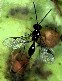El minador Esta plaga, Lyriomyza sp. pertenece al orden de las Dipteras, familia Agromyzidae (75,76,77). La hembra adulta es una mosca muy pequeña, de colores amarillo y negro (Fifura 6), la cual perfora la epidermis de la hoja de la planta hospedera. En algunas de esas picadas deposita sus huevos, uno a uno, los cuales quedan insertados dentro de la hoja a manera de puntos; el resto de las picadas que realiza son para alimentarse. Al emerger del huevo, la larva comienza a alimentarse del material vegetal. De esta manera, abre una pequeña galería (mina) en forma de serpentina, la cual se alarga y ensancha a medida que la larva crece. Estas minas, lineales o irregulares, de color blanquecino o verde más claro que el color de las hojas, ocasionalmente pueden necrosarse. Las minas individuales carecen de importancia. Si las poblaciones del insecto son altas las plántulas se debilitan y pueden incluso morir; en plantas de repollo maduras, generalmente, el daño se presenta en las hojas externas, sin detrimento en el crecimiento de la planta.