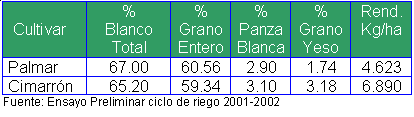 La calidad molinera del grano del cultivar Cimarrón, en comparación con el cultivar Palmar (el cual tiene calidad de grano más estable) presenta grano suelto, blando, sin aroma, con temperatura de gelatinización intermedia (69-73°C) y con amilosa intermedia (31%), según se muestra en los cuadros siguientes: