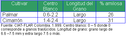 del grano del cultivar Cimarrón vs. el cultivar Palmar: centro blanco, longitud y amilosa. |