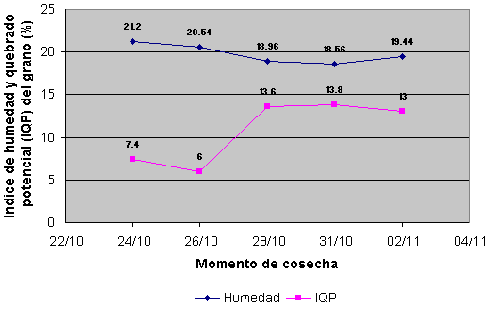 La cosecha en campo para este cultivar debe realizarse cuando el grano tenga un contenido de humedad que no sea inferior a 20,5%, ya que por debajo de éste, el 'Índice de Quebrado Potencial' del grano (IQP) se incrementa, como puede observarse en la figura siguiente: