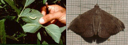- El pegador de la hoja, Omioides indicata (Fabricius) (Fig. 3), familia Pyralidae. Las larvas se alimentan del tejido parenquimático y esqueletizan las hojas, además, pegan varios foliolos formando una cámara, donde se refugia.