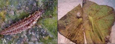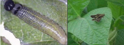 - El enrrollador de las hojas de las leguminosas, Urbanus proteus (Linnaeus) (Fig. 2), pertenece a la familia Hesperidae. Sus larvas se alimentan del follaje, se presentan en forma muy dispersa y tienen el hábito de enrollar y pegar el borde de las hojas con hilos de cera, lugar en donde se resguarda y pasa los estados de larva y pupa.