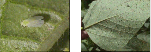 - La mosca blanca es un insecto muy pequeño que desarrolla sus colonias en el envés de las hojas. Causa daño directo al chupar la savia de las plantas e indirectos por la transmisión de enfermedades virales y por el excremento azucarado que desarrollan en altas poblaciones, el cual permite el crecimiento de hongos. Control natural: