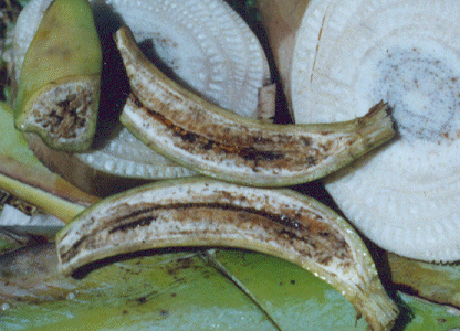 Medidas de Control - Ubicar el “foco” de infección y establecer una “zona protectora”. Para esto, se traza una circunferencia de seis metros de radio y luego se delimita toda la zona con una cuerda con el propósito de no permitir el paso de ninguna persona, e indicar a los trabajadores que en esa área no se debe realizar ninguna labor agronómica. Como una medida de seguridad, las plantas o cepas afectadas, así como todas las plantas que se encuentren dentro de la “zona protectora”, se deben eliminar en el sitio en el cual se encuentren. Para erradicarlas es necesario aplicar una solución de Glifosato al 20% o 2-4-D amina al 0.5%, usando una jeringa, cuya aguja se introduce en el pseudotallo. La dosis depende de la edad y altura de la planta. En hijos y plantas jóvenes se aplica un total de 15 ó 20 centímetros cúbicos (cc) de la solución, mientras que a las plantas adultas se les inyectan 30 centímetros cúbicos del producto en varias partes del pseudotallo. Después que las plantas están muertas se dejan secar completamente, se cortan en pedazos y se queman en el mismo lugar. - Si los productores desean volver a plantar en los puntos de siembra que corresponden a aquellas plantas que se erradicaron con aplicaciones de Glifosato o 2-4-D AminaÔ, primero, deben desinfectar toda esa área. Para esto, se aplica Formol al 46% y luego se cubre con un plástico toda la superficie tratada durante un lapso de 15 a 30 días. Transcurrido este período se retira el plástico, se remueve el suelo para airearlo y se esperan 15 días para sembrar nuevamente. También se puede usar Bromuro de Metilo como desinfectante, a razón de 0.5 Kg de gas por cada 10 metros cuadrado de terreno. Este producto es altamente eficaz y acorta el período de espera, pero requiere de un manejo especial y del uso de equipos especiales por ser un gas venenoso. En el caso de usar Bromuro de Metilo, el suelo se cubre previamente con un plástico, y se sella por todo su contorno con tierra apisonada para evitar que se escape el gas; luego, se procede a aplicar el gas a través de un orificio. El plástico se retira a los siete o 10 días después de la aplicación, se remueve el suelo y se airea; a partir de ese momento el área queda apta para la siembra (Belalcázar 1991, Ordosgoitti 1999).