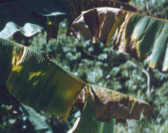 Síntomas Después que el patógeno penetra en las plantas se multiplica rápidamente y en muy corto tiempo las toxinas producidas por este organismo causan los síntomas de la enfermedad, los cuales se manifiestan de la siguiente manera: En el estado adulto de la planta se observa amarillamiento, flacidez y marchitamiento de las hojas (Fig. 1), las cuales se doblan y permanecen adheridas al pseudotallo. En la bellota, las bracteas que cubren las flores se marchitan y no se levantan, ni se enrollan.
