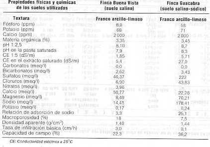 Propiedades de los dos suelos bajo estudio y su relación con el comportamiento varietal Antes de iniciar el experimento, el suelo salino de la finca Buena Vista presentó una conductividad eléctrica (CE) en el extracto saturado de 5,4 dS/m, con predominio de sales de sulfato de calcio y pH normal para el cultivo de la caña de azúcar (3) ; relación de adsorción de sodio (RAS) igual a 3,3; baja fertilidad; sin evidencias de compactación. El suelo salino-sódico de la finca Guacabra registró valores de CE en el extracto saturado de 27 dS/m, muy alta para casi la totalidad de los cultivos (1), donde la sal sulfato de sodio presentó la mayor concentración. También el pH, (1 :2,5) igual a 8,7, resultó muy alto para el cultivo (3); el RAS fue de 25, 1 con tasa de infiltración básica (TIB) muy baja (0, 1 cm/ha). Estos dos últimos valores y los de CE indican que se está ante un suelo salino-sódico, donde además no se observó, en el momento del muestreo de suelo, desarrollo de ningún cultivo, sólo malezas ya su alrededor había caña de azúcar. También este suelo presentó evidencias de compactación por los altos valores de densidad aparente (1 ,44 g/cm3) y baja macroporosidad (7,5%). Asimismo, se detectaron signos de mal drenaje interno (moteados grises intensos, en el perfil). Ambos suelos presentaron textura franco arcillo-limoso (Cuadro 1). Al finalizar el ensayo, el pH (1 :2,5) se mantuvo constante (Cuadros l' 2 y 3) en los dos suelos. Los valores de CE presentaron un ligero aumento en la mayoría de tratamientos del suelo salino (Cuadros 1 y 2) , por los aportes de sales del agua de riego utilizada. En el suelo salino-sódico la CE descendió en un 44% como promedio en todos los tratamientos (Cuadro 3), como consecuencia de haber sido regados con aguas de concentración salina relativamente alta, con predominio de sales de sulfato de calcio, lo que provocó un descenso considerable, por lixiviación de las sales de sulfato de sodio, originalmente presentes en mayor concentración en estos suelos, al disminuir de 200 meq/l hasta 24 meq/l, lo que permitió que el RAS descendiera de 25, 1 hasta 4, 1; de acuerdo con los resultados de análisis de salinidad realizado a siete unidades experimentales componentes de una repetición, al finalizar la prueba. Es importante resaltar que, a pesar de haberse registrado al inicio, alta concentración salina en el extracto saturado del suelo salino-sódico (27 dS/m), casi todas las variedades habían germinado a los 30 días de la siembra en este suelo. Aunque en total, la germinación y el número de brotes obtenidos al final del experimento fue mucho mayor en el suelo salino, el cual tuvo una CE de 6,42 dS/m al final del ensayo. Los cultivares que dieron los mayores rendimientos, excepto la V74-7, registraron los más altos valores niveles de sales solubles (B49119, B64129 y PR692176) al terminar la prueba en el suelo salino (Cuadro 2). En el suelo salino-sódico ocurrió todo ¡o contrario, a pesar de que no hubo mayores diferencias de CE entre tratamientos al término del experimento (Cuadro 3). CONCLUSIONES 1. Las variedades de caña de azúcar V74-7, PA692176, B64129 y B49119, fueron las que dieron los más altos valores de peso fresco y peso seco, en los dos suelos evaluados 2. La conductividad eléctrica en la relación 1 :5 en el suelo salino donde crecieron los genotipos con mayor producción de material vegetal, registraron los mayores valores de sales solubles, superiores a 1,75 dS/m, al finalizar la prueba. En el suelo salino-sódico esta situación fue , variable y los valores de CE oscilaron entre 3,06 y 3,81 dS/m. En ambos suelos, la CE presentó valores, en todos los casos, superiores al nivel crítico de CE 1 :5, señalado por Zérega (14) en 1,46 dS/m, para este cultivo. 3. Los cultivares más sobresalientes también registraron los más altos valores de la relación peso seco/peso fresco y los menores en porcentaje de humedad en la planta. Estos índices son sustitutivos entre sí. Aunque la My5514 y NCo310 dieron buenos índices entre los genotipos que registraron posiciones intermedias y bajos en producción de material vegetal, su tolerancia a sales ha sido reportada en la literatura (9; González, comunicación personal, 1992). 4. Las variedades PA980, PA1013, PA1 028, PA61632, C0421 , caña blanca, V68-78 y B7549 resultaron susceptibles a la salinidad del suelo, bajo las condiciones en que se condujo este experimento. EVALUATION OF 14 SUGARCANE VARIETIES IN TWO SALT AFFECTED SOILS UNDER SARAN SHADE ABSTRACT A trial was conducted to choose sugarcane cultivars tolerance to 5alinity and critical level of salt soil in experimental conditions. This experiment was carried out under sara shade in Yaracuy Experimental Station in Yaritagua. Two silt loam soils were used: a saline soil of electrical conductivity of saturated extract (ECse) = 5.4 dS/m to 25°C and other saline-sodic soil with ECse = 27 dS/m and sodium adsorbtion ratio (SAR) = 25,1 obtained in two sugarcane farms in the Azucarera Río Turbio zone. Sugarcane varieties employed in this study are known by researchers and farmers as salinity or drought tolerance. The cultivars V74-7, PR692176, B64129 and B49119 obtained the most dry weight and fresh weight yields and the index dry weight/fresh weight ratio or percentage of moisture in plants, to choose as tolerance salinity genotypes. B64129 and B49119 varieties are susceptible to the main sugarcane diseases which discard them. BIBLIOGRAFÍA 1. ALLISON, L. E.; J. W. BROWN; H. E. HARWARD; L. BERNSTEIN yotros. 1954. Diagnosis and improvement of salrne and alkaline soils. USDA. Handbook No.60. 160 p. 2. AYERS, R. S. and D. W. WESTCOT. 1976. Water quality for agriculture. Irrigation and drainage paper No.29. FAO. 98 p. Rome. 3. BENACCHIO S., S. 1982. Algunas exigencias agroecológicas en 58 especies de cultivo con potencial de producción en el trópico americano. Un compendio. FONAIAP. 202 p. Venezuela. 4. BONN