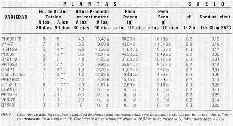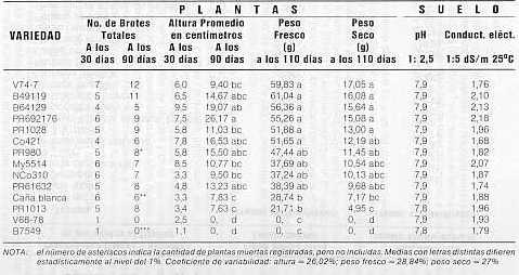 Altura de plantas En los Cuadros 2 y 3 y Figura 1, se presentan los valores de altura promedio de planta en centímetros (cm), alcanzados por variedad, a los 90 días después de la siembra y cerca dela fecha de finalización del experimento las plantas lograron mayor altura en el suelo salino porque los niveles y tipos de sales presentes en este suelo, son mucho menores y menos nocivas que las existentes en el suelo salino-sódico. En el suelo salino (Cuadro 2), las variedades PR692176 y B64129alcanzaron las mayores alturas de plantas, con 26, 17 y 19,07 cm, respectivamente. Sin embargo, la variedad V74-7, la cual obtuvo el más alto valor en peso seco y el segundo puesto en peso fresco, fue la que alcanzó una de las más bajas alturas de planta, con 9,4 cm, pero obtuvo un mayor número de brotes, compensando de esta manera su bajo porte. En el suelo salino-sódico (Cuadro 3 y Figura 1 b) la variedad PR692176 fue la que alcanzó la mayor altura de planta y los más altos valores en peso fresco y peso seco. Sin embargo, este cultivar no difiere estadísticamente al nivel del 1% de las variedades: B49119,B64129, Co421 , caña blanca, PR980 y V74-7, pero sí del resto de genotipos evaluados en este experimento. Al igual que en el otro suelo, la V74-7 estuvo casi en los últimos lugares de altura de planta, pero ocupó el segundo puesto en valores de peso fresco y peso seco, lo cual indica que ésta es una variedad con un alto potencial de producción de material vegetal en esos suelos. Así mismo, se observa muy poca relación entre altura de planta y valores de peso fresco y peso seco entre genotipos. Peso fresco y peso seco En los Cuadros 2 y 3 y Figuras 2 y 3 se presentan los valores de peso fresco y peso seco en gramos, por variedad de caña de azúcar en los dos suelos evaluados. En el suelo salino (Cuadro 2 y Figuras 2y 3), las variedades se separaron en tres y cuatro grupos para peso fresco y seco, respectivamente, por diferenciarse estadísticamente entre sí al nivel del 1%. Dentro del grupo superior se incluye un total de diez cultivares, de los cuales los que dieron los mayores valores fueron: V74-7, B49119, B64129 y PR692176. Las dos últimas dieron las mayores alturas de planta, mientras que las primeras el más alto número de brotes. En el suelo salino-sódico (Cuadro 3 y Figuras 2 y 3), las variedades se separaron en cuatro y cinco grupos para peso fresco y seco, respectivamente, los cuales presentan diferencias estadísticas entre sí al nivel del 1%. Dentro del grupo superior se ubicaron un total de siete variedades; sin embargo, las más sobresalientes fueron los genotipos: PR692176, con alrededor de un 50% más de producción de material vegetal que sus más cercanas seguidoras: V74-7, 864129, PR980 y 849119. La PR692176, además de haber obtenido los mayores valores en peso fresco y peso seco, también ocupó el primer lugar en altura promedio de plantas y el segundo lugar en números de brotes, después de la V74-7. Similar que en el suelo salino, la B64129 y B49119 ocuparon las primeras posiciones (el tercer lugar) en valores de altura y número de brotes, respectivamente.