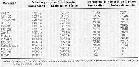 Estas relaciones entre las variables de plantas discutidas, evidencian que estos genotipos disponen de mecanismos diferenciales para defenderse de las altas concentraciones salinas del suelo que producen estrés hídrico y/o toxicidad. Así se tiene que, la PR692176 y B64129 incrementan su altura, quizás mediante una mayor profundidad radical en suelos con altas concentraciones salinas, en relación con otros genotipos sensibles, mientras que la V74-7 y la B49119 aunque con menor altura de planta que las variedades mencionadas, se defienden de las sales mediante la emisión de un mayor número de brotes, con lo cual no se afecta su crecimiento, traducido en una mayor producción de material vegetal. Relación peso seco/peso fresco, porcentaje de humedad en la planta Los genotipos que registraron los más altos valores de producción de material vegetal (V74-7, B64129, PR692176 y B49119) fueron los que dieron las más altas relaciones peso seco/peso fresco y los menores porcentajes de humedad en la planta (Cuadro 4), en los dos suelos evaluados. Se exceptúa a los cultivares NCo310 y My5514, cuyos rendimientos estuvieron muy por debajo de las variedades sobresalientes antes mencionadas, pero registraron valores de los índices en discusión, similares a los cultivares más destacados. Estos últimos genotipos han sido reportados como tolerantes a la salinidad (9; González, comunicación personal de resultados experimentales en proceso de publicación, 1992). La mayoría de los genotipos evaluados mantuvieron más o menos iguales los valores de la relación peso seco/peso fresco y porcentaje de humedad en la planta, en los dos suelos bajo estudio (Cuadro 4). No se registraron diferencias estadísticas al nivel del 5% entre cultivares en los dos suelos, para la primera variable. Estos índices reflejan la capacidad de cada variable en producir materia seca bajo condiciones de estrés en medios afectados por sales o bajo condiciones de sequía. Las más tolerantes muestran valores altos en la relación peso seco/peso fresco y bajos porcentajes de humedad en la planta, y viceversa. Es importante señalar que las variedades PR980 y PR61632, aunque se mostraron sensibles a la salinidad bajo las condiciones en que se condujo este experimento, han sido señaladas por investigadores y cañicultores como tolerantes a sales (11; 14; González, comunicación personal, 1992). Sin embargo, la PR980, en experimentos conducidos en los últimos dos años ha resultado sensible a la salinidad (6; González, comunicación personal, 1992).