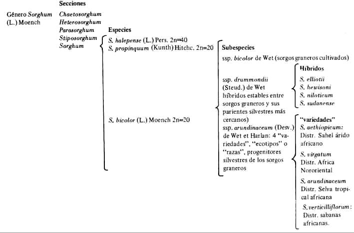 La posibilidad de cruce entre 'Falso Johnson' y S. bicolor ssp. bicolor se comprobó con la progenie homogénea obtenida a partir del cruce 'Falso Johnson' x cultivar macho estéril ATX.399 (Cuadro 4). Los resultados muestran un escaso vigor híbrido expresado en un porte y longitud de láminas ligeramente superior a ambos padres. Como caracteres intermedios se encontró: densidad de macollamiento, diámetro de tallos, anchura de láminas, grosor del raquis y ramas de la inflorescencia, densidad, longitud y número de ramas por verticilo de la inflorescencia; como caracteres próximos al macho estéril: forma de la macolla, número de nudos/inflorescencia, verticilación y subverticilación, ¿espiguillas más o menos persistentes?. Como caracteres próximos al 'Falso Johnson': color de las láminas, dimensiones de la panícula, dimensiones de la espiguilla (aun cuando la anchura es ligeramente mayor), superposición de las glumas hasta el ápice. En este híbrido no se encontraron espiguillas llenas observándo se , en general, aborto de dos anteras, la única presente inclusa y vacía; el gineceo por lo general normal pero no fecundado, y a veces ovario y estigmas rudimentarios o atrofiados. Lo anterior demuestra que el híbrido es estéril, factible de propagarse sólo por estacas. DESCRIPCIONPlanta anual, desde 412 meses según las condiciones de crecimiento. Porte desde 0,80-2,20 (2,40) m. Los individuos más frecuentes (malezas arvenses o marginales a los cultivos) alcanzan 1,20-1,80 m. Macollamiento monocaule (raro) por extreme deficiencia lumínica, a multicaule con hasta 20 macollos basales en condiciones dásicas, pudiendo llegar a 30-50 en condiciones de cultivo. Diámetro basal, 3-6 (- 10) cm, forma geniculado-ascendente en condiciones muy favorables de luz, en general cilindro-obcónica hasta erecta y cilíndrica en condiciones de alto competencia. Sistema radical subterráneo abundante, profundo y de raíces gruesas. Raíces fúlcreas presentes, pudiendo llegar a ser absorbentes. Tallos, 5-7 mm de (, normalmente ramificados. Hojas del macollo principal de 11-16, normalmente 4-6 (-8). Vainas desde 10-22 x 2 cm; las inferiores sobrepasando en longitud al entrenudo respectivo y las superiores sobrepasadas por los entrenudos; vainas prepedunculares y pedunculares muy grandes, las últimas 36-45 cm de largo; pilosas en la vecindad de la lígula, de color verde-claro excepto en los extremes, blanco-perladas internamente. Lígulas membranosas ancho-corto-triangulares, 2 mm de ancho máximo, microciliadas externamente. Láminas fasciarias sensu stricto (largo: ancho = 12 ó más), con dimensiones de 30-50(-60)x 2-3(-3,2) cm, en general de color verde-amarillento y excepcionalmente alga oscuro en condiciones de alto fertilidad y/o semisombra. Base breviauriculada y equilátera, vena media blanca de 2 mm o menos; posición con respecto al eje, variable con ]a edad: agudas cuando adultas y obtusas en fase senescente; pulimento opaco, indumento desnudo, pubescencia glabra, nervación principal alga prominente por el haz, con más o menos 16-18 nervios; mancheo por enfermedades, escaso o excepcionalmente abundante. Inflorescencias emergentes dispuestas en panículas laxas a muy laxas, conformando pirámides inequilateras de ápice incurvo, la cual varía con la edad; cuan